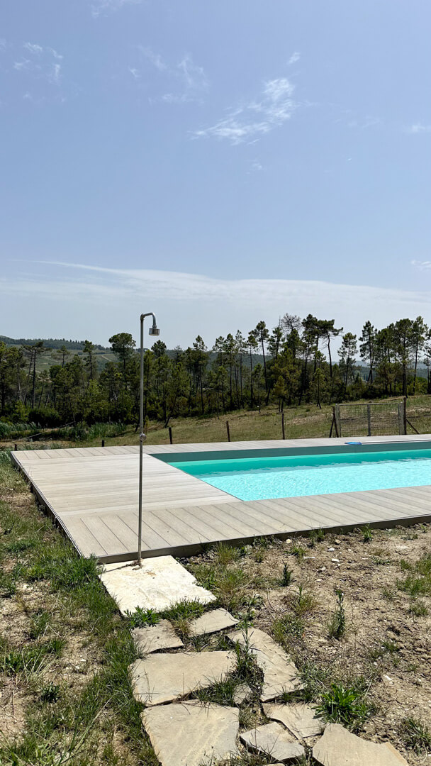 Il risultato è un effetto estetico sorprendente: la piscina si fonde con l’ambiente e sembra interrata, pur mantenendo la praticità e la flessibilità di una struttura fuoriterra.