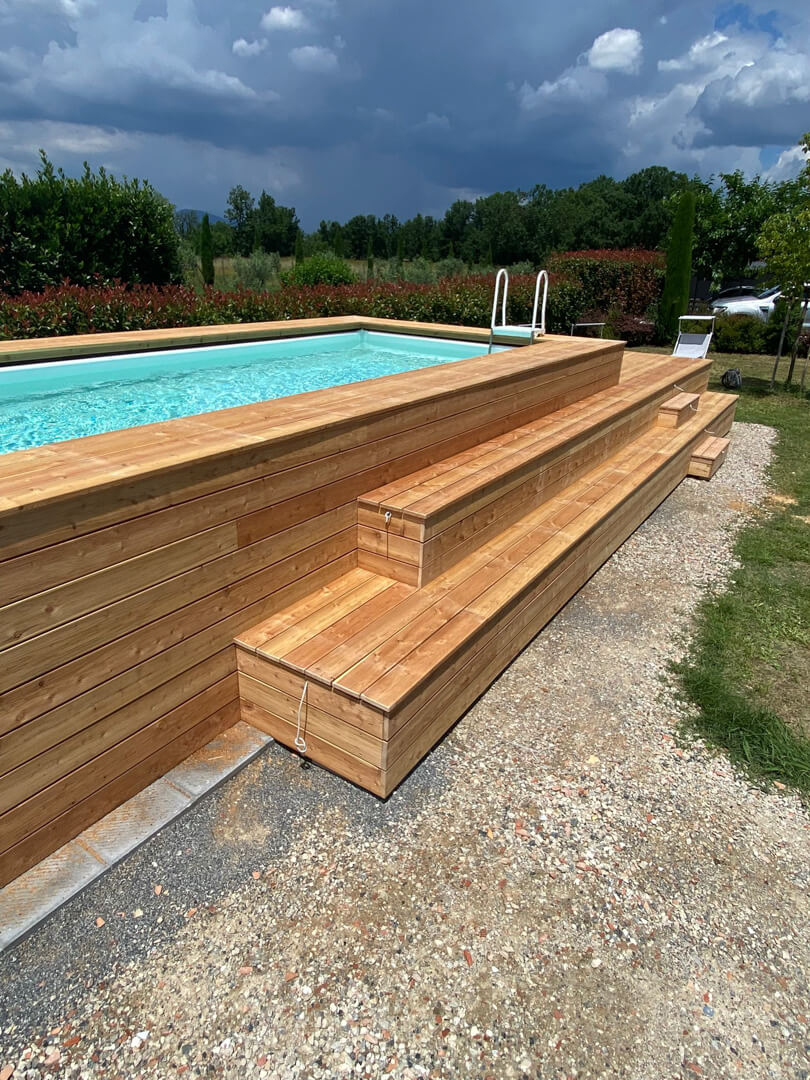 In Acqualab, partiamo da una piscina fuoriterra e la trasformiamo in un progetto architettonico su misura, costruendo attorno ad essa una pedana in legno personalizzata che la integra perfettamente nel contesto.